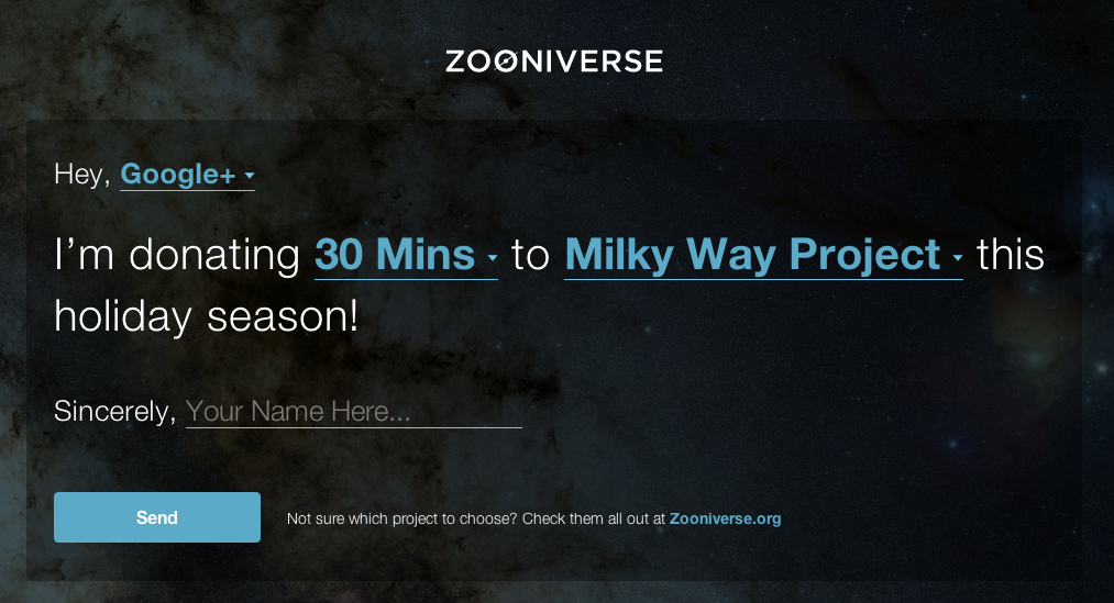 Regardless of where you are in the world, we think that the best thing most of you can give us is your time. So we’ve created giving.zooniverse.org which you can use to tell the world (or your social network at least) that you’re giving some of your time to the Zooniverse this holiday season. Perhaps you can help spread some citizen science cheer – or just show off that you’re an awesome contributor to science online.