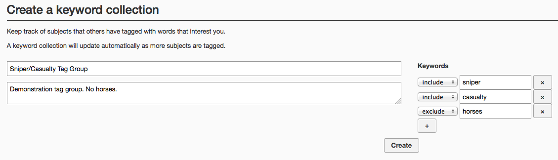 At this point, there is no way to create a collection that includes, say, on Operation War Diary, #casualty or #sniper—only objects that have #casualty and #sniper. You can, however, exclude certain tags: e.g., all #casualty objects not also tagged #sniper, or #casualty and #sniper but no #horses.