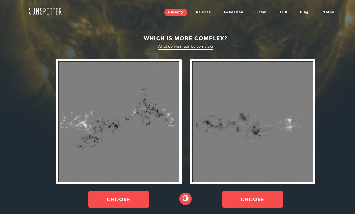 In order to achieve these goals, volunteers like you compare two sunspot group images taken by the Solar and Heliospheric Observatory and choose the one you think is more complex. Sunspotter is what we refer to as a “popcorn project”. This means you can jump right in to the project and that each classification is quick, about 1-3 seconds.