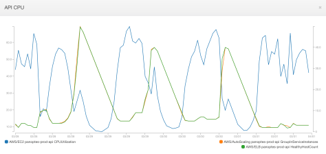 Traffic during the ABC show was lower than during the BBC show (Australia has a smaller population than the UK, so this was as expected). That week we scaled the API to 40 instances the first night, and 20 instances for the second and third nights.