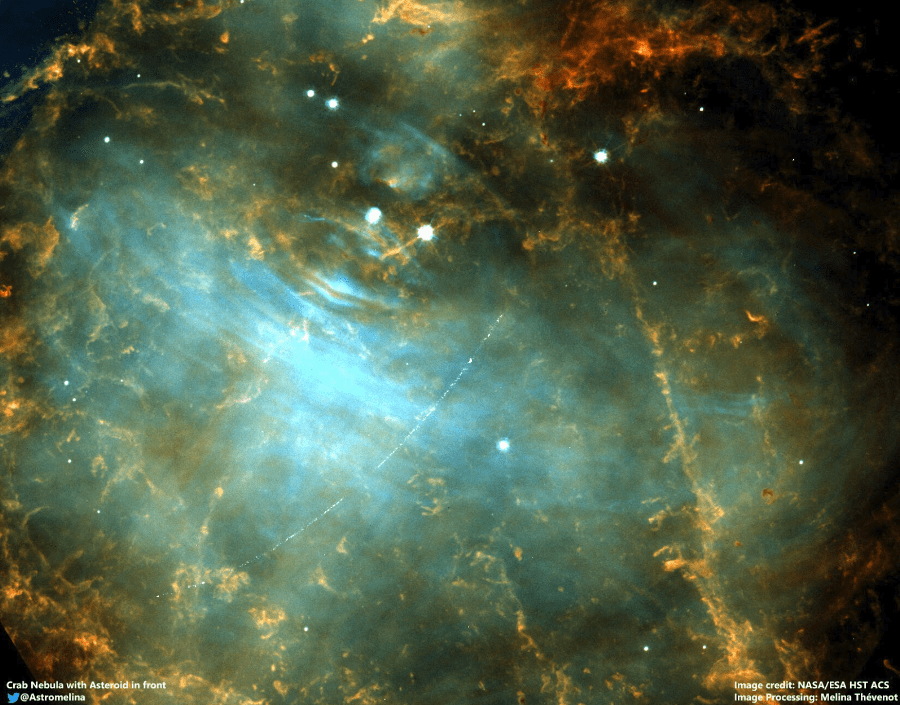 Main-belt asteroid 2001 SE101 passing in front of the Crab Nebula (M1). The streak appears curved due to Hubble’s orbital motion around the Earth. Credit: ESA/Hubble & NASA, M. Thévenot (@AstroMelina); CC BY 4.0
