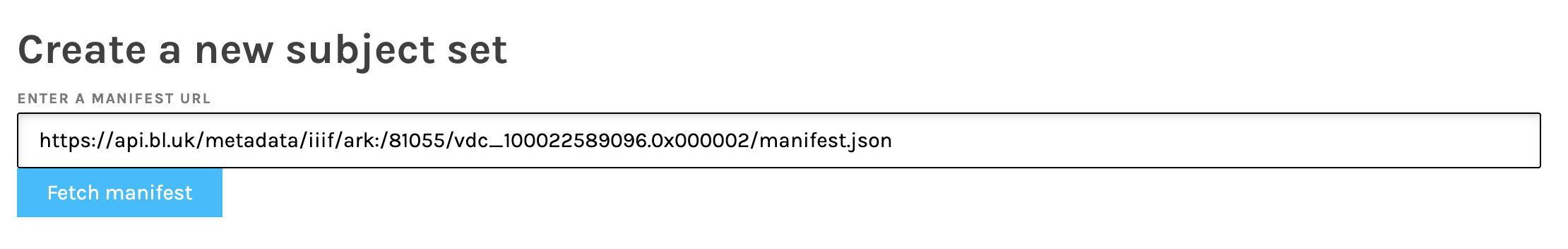 First, we wanted to figure out a way to create a Zooniverse subject set from a IIIF manifest. We figured the easiest approach would be to use the manifest URL, so Jim built a tool that imports IIIF manifests via a URL pasted into the Project Builder (see image below).