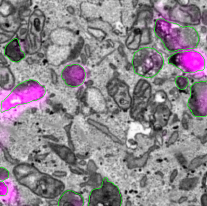 In Etch A Cell – Demolition Squad, volunteers were asked to draw around lysosomes. To make the lysosomes easier to spot they were labelled with a marker, that is shown in the image above as pink. This image also shows lysosome segmentations done by an expert in green.