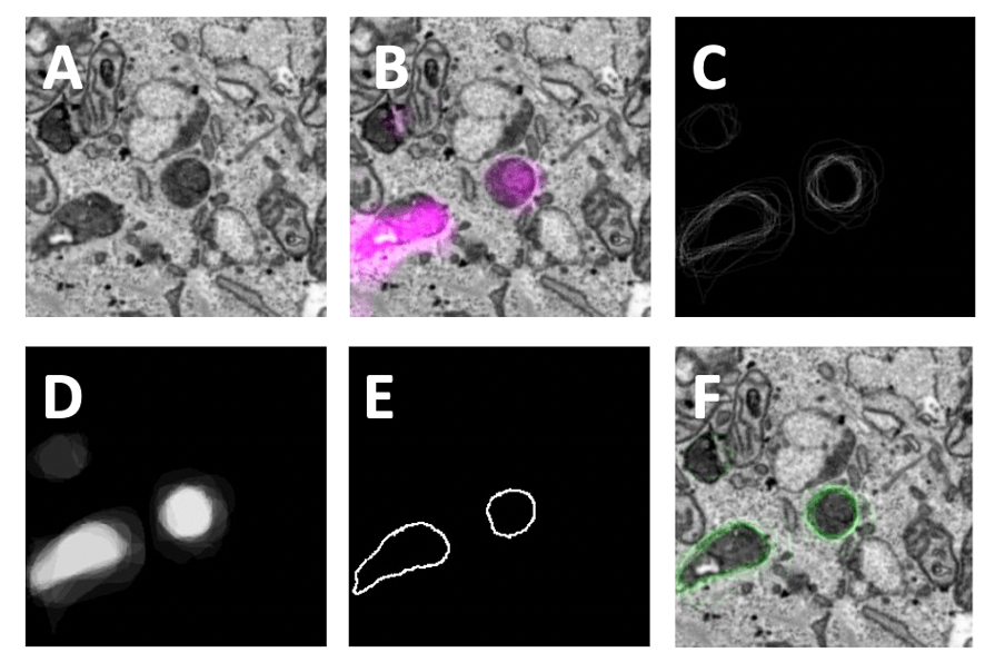 The images above show the raw data (A) and this data overlaid with the pink marker that highlights the lysosomes (B). Image B is the one Zooniverse volunteers would have seen in the project interface. All the volunteer segmentations submitted for this image are shown overlaid in image C. Image D also shows the volunteer segmentations together, but in this image the line drawings have been ‘filled in’ and stacked on top of each other to make it easier to see where the volunteers agree there is a lysosome (the more volunteers who annotated a region, the brighter white it shows). Image E shows where most of the volunteers agreed there were lysosomes in this image, and image F shows how this corresponds to the raw data image (A). From these images you can see how collectively, Zooniverse volunteers did a great job at drawing around the lysosomes.