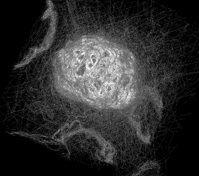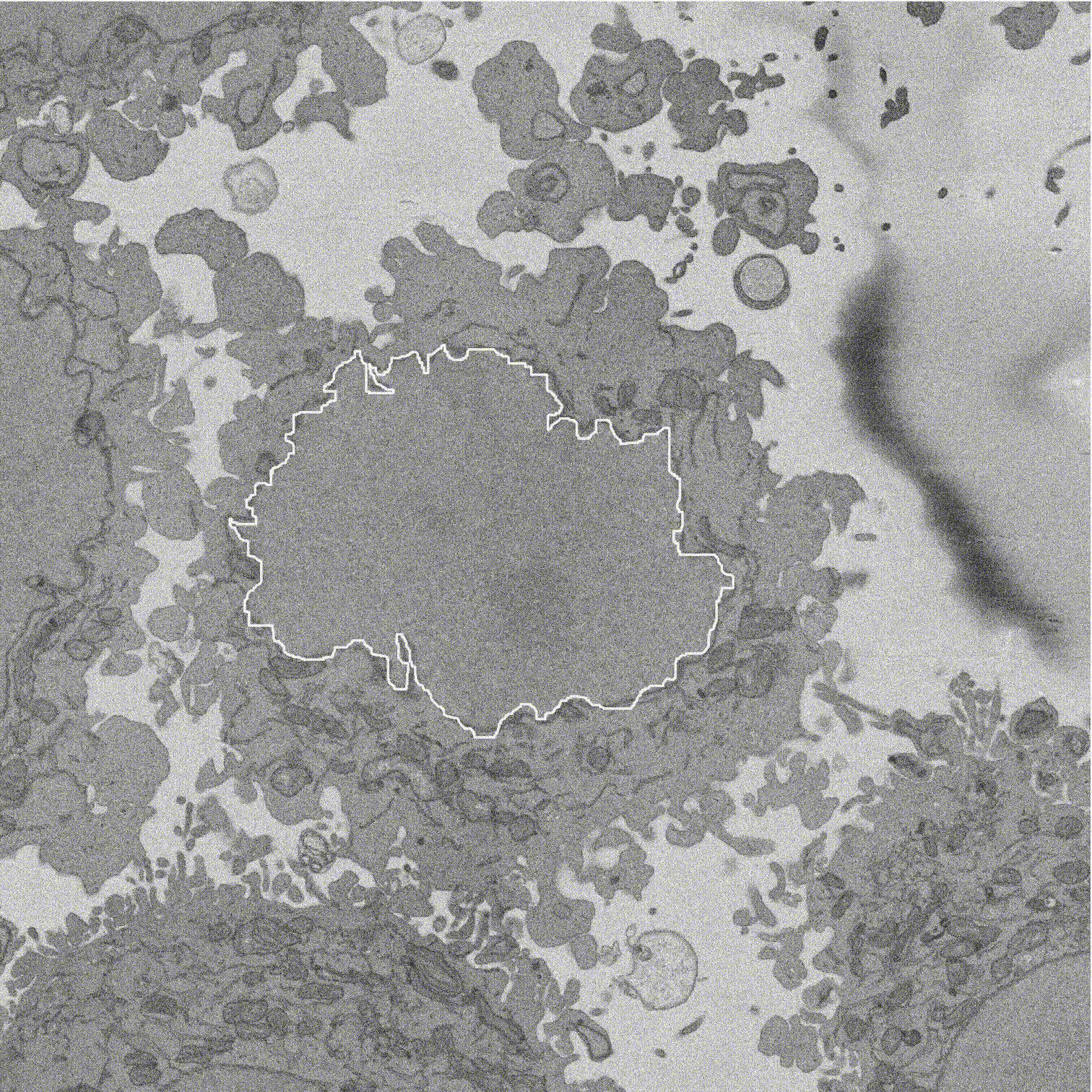 3. There’s power in a crowd! The image below shows an overlay of every single segmentation for one of the nuclei studied in Etch A Cell. As you can see, through the collective effort of Zooniverse volunteers, something beautiful emerges – by overlaying everyone’s effort like this, you can see the shape of the nuclear envelope begin to appear!