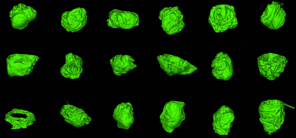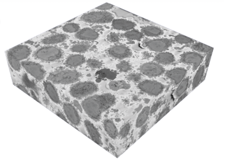1. Zooniverse volunteers dedicated a huge amount of effort! Zooniverse volunteers submitted more than 100,000 segmentations across the 4000 images analysed in this first Etch A Cell project. Through this effort, the nuclear envelopes of 18 cells were segmented (shown below in green) from our original data block (shown below).