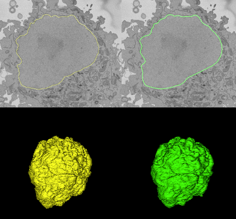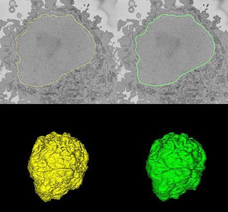 To make sense of all of this data, we developed an analysis approach that took all of these lines and averaged them to form a ‘consensus segmentation’ for each nuclear envelope. This consensus segmentation, produced through the collective effort of volunteers, was incredibly similar to that produced by an expert microscopist. You can see this in the image below: on the left (in yellow) you can see the expert segmentation of the nuclear envelope of one cell compared to the volunteer segmentation (in green). The top image shows a single slice from the cell, the bottom image shows the 3D reconstruction of the whole nuclear envelope.