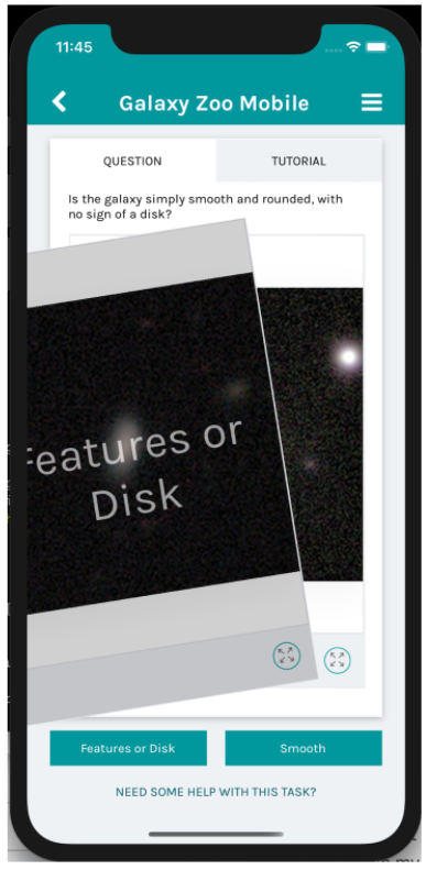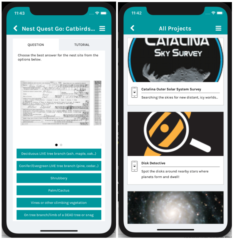 Right now, you can go into the app and contribute to Galaxy Zoo Mobile, Catalina Outer Solar System Survey, Disk Detective, Mapping Historic Skies, Nest Quest Go, or Planet Four: Ridges. And we have more projects on the way!
